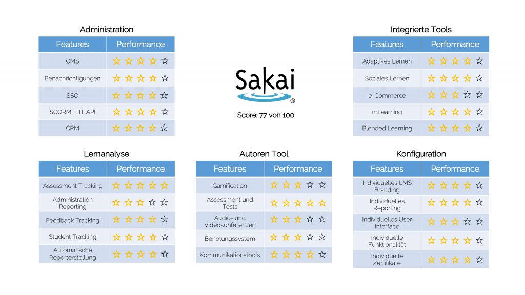Sakai ist eine Open-Source eLearning-Lösung, die für kleine bis mittlere Unternehmen oder Studentengruppen geeignet ist. Die Plattform ist mit einer hohen Anzahl Plugins von Drittanbietern kompatibel und kann umfassend angepasst werden, um jegliche Bedürfnisse von Studenten und Lehrern zu erfüllen. Einige der Funktionen sind allerdings weniger benutzerfreundlich, zum Beispiel fanden viele Gutachter und Kommentatoren den Kalender etwas schwierig zu benutzen, die Arbeit mit Medieninhalten sei ziemlich kompliziert und E-Mail-Benachrichtigungen seien schwer einzurichten. Da es sich um eine Open Source-Lösung handelt, kann Sakai in den Händen einer erfahrenen IT-Abteilung sehr gut funktionieren.