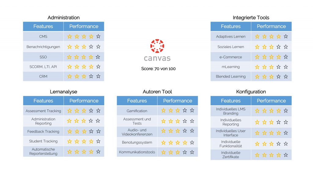 Canvas by Instructure ist ebenfalls eine Freemium-LMS-Lösung, die unter dem Motto vertrieben wird, einfach, benutzerfreundlich und in hohem Maße anpassbar zu sein. Canvas ist mobilfreundlich, ermöglicht eine intensive Zusammenarbeit der Studenten und ist eine gute Wahl für kleine Hochschulen. Darüber hinaus ist Canvas zwar als Open Source deklariert, aber die endgültige Kontrolle über die Entwicklung von Canvas liegt immer noch in den Händen von Instructure, sodass einige spezifische Module möglicherweise vor Ort oder von Dritten entwickelt werden müssen.
