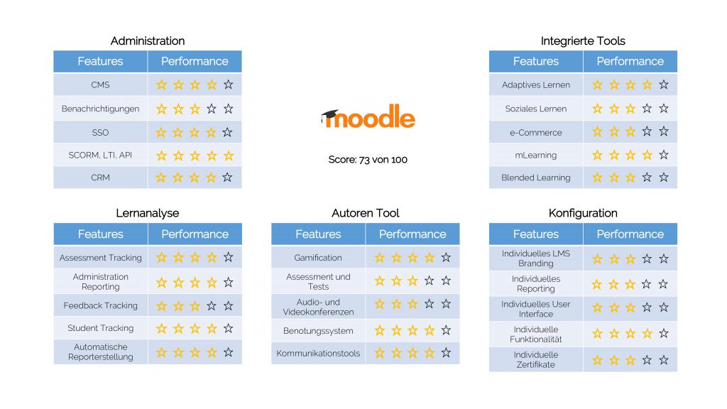 Moodle ist eine Freemium-Online-Lernlösung, bei der grundlegende Funktionen kostenlos sind und erweiterte Funktionen im Bezahlmodell erhältlich sind. Es handelt sich um eine beliebte Lösung, die Standardbedürfnisse und -anforderungen erfüllt und eine stabile eLearning-Lösung für mittlere bis große Unternehmen und Bildungseinrichtungen bietet. Moodle bietet eine große Vielfalt an verfügbaren Erweiterungen und es gibt keine Abonnementgebühren. Allerdings gibt es einige schwerwiegende Nachteile – die Lernplattform ist nicht leicht anpassbar, jeder Server erfordert einen separaten Satz Hardware zum Betrieb und die Kunden müssen Add-ons und Plug-ins selbst entwickeln. Mit einem großen Budget und den entsprechenden Fähigkeiten der IT-Abteilung kann Moodle jedoch ein vollumfängliches Lernerlebnis schaffen.