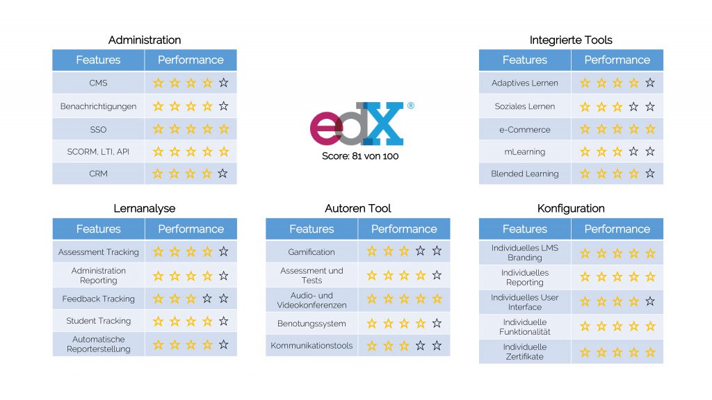 Die Open edX Plattform ist eine Open-Source-Bildungsinitiative, ein Joint Venture von Giganten wie MIT, Harvard, Berkeley, Google und anderen namhaften Organisationen. Aufgrund der XBlock-Technologie, die eine einfache Erstellung und Verwaltung von Inhalten sowie eine detaillierte Anpassung der Plattform ermöglicht, hat Open edX sehr an Beliebtheit gewonnen. Die leichte Skalierbarkeit der Plattform eignet sich sowohl für Unternehmensschulungen als auch für die Onlinelehre. Die Technologie von Open edX bietet eine Vielzahl an fertigen XBlocks, virtuelle Labore für Experimente und sogar einen Chatbot für eine bessere UX. Die Open edX Plattform kann zu einem großartigen Nutzererlebnis werden. Zu den Mängeln gehören die Notwendigkeit einer guten Kenntnis von Ansible, Vagrant und Virtualbox für die korrekte Installation und ein ziemlich langer Prozess der Einrichtung des Open edX Analytics-Systems “Insights”.
